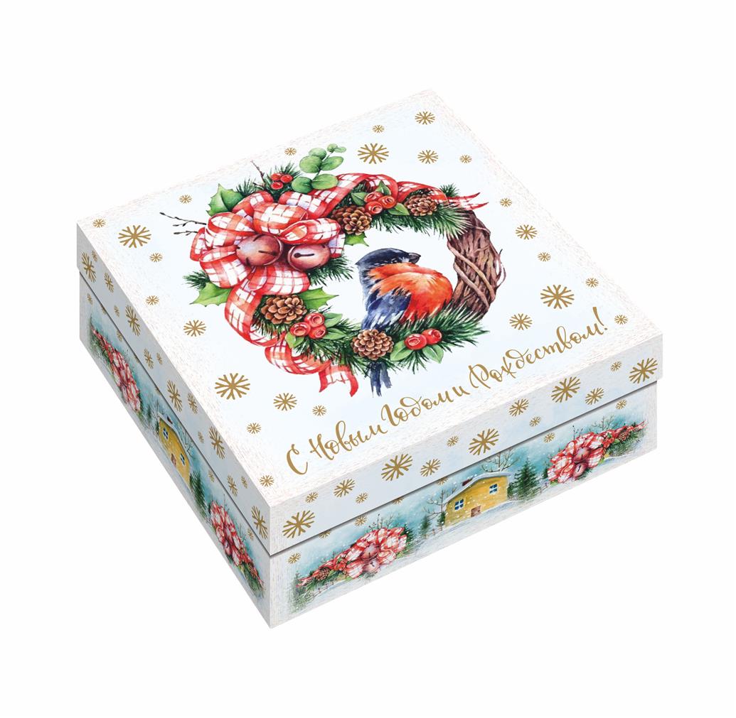 Подарочная коробка новогодней тематики, конструкции крышка/дно без окна, размеры 15,8х15,8х6,3 см., продается упаковками по 5 шт (цена указана за 1 шт), вес подарка 500 гр