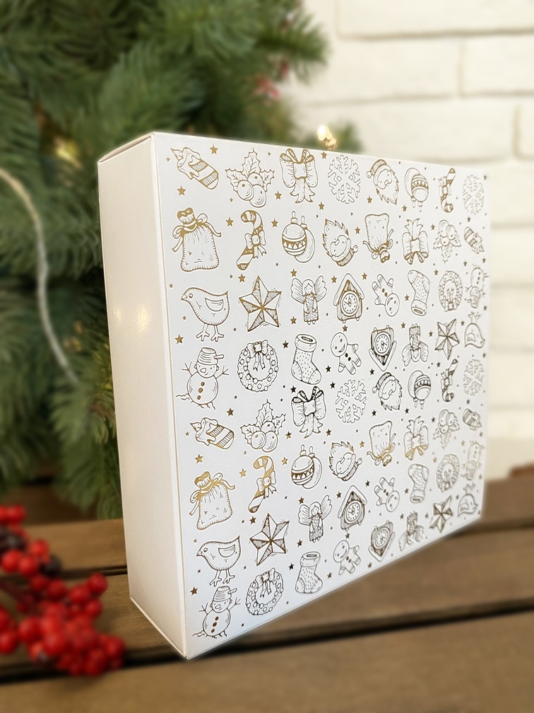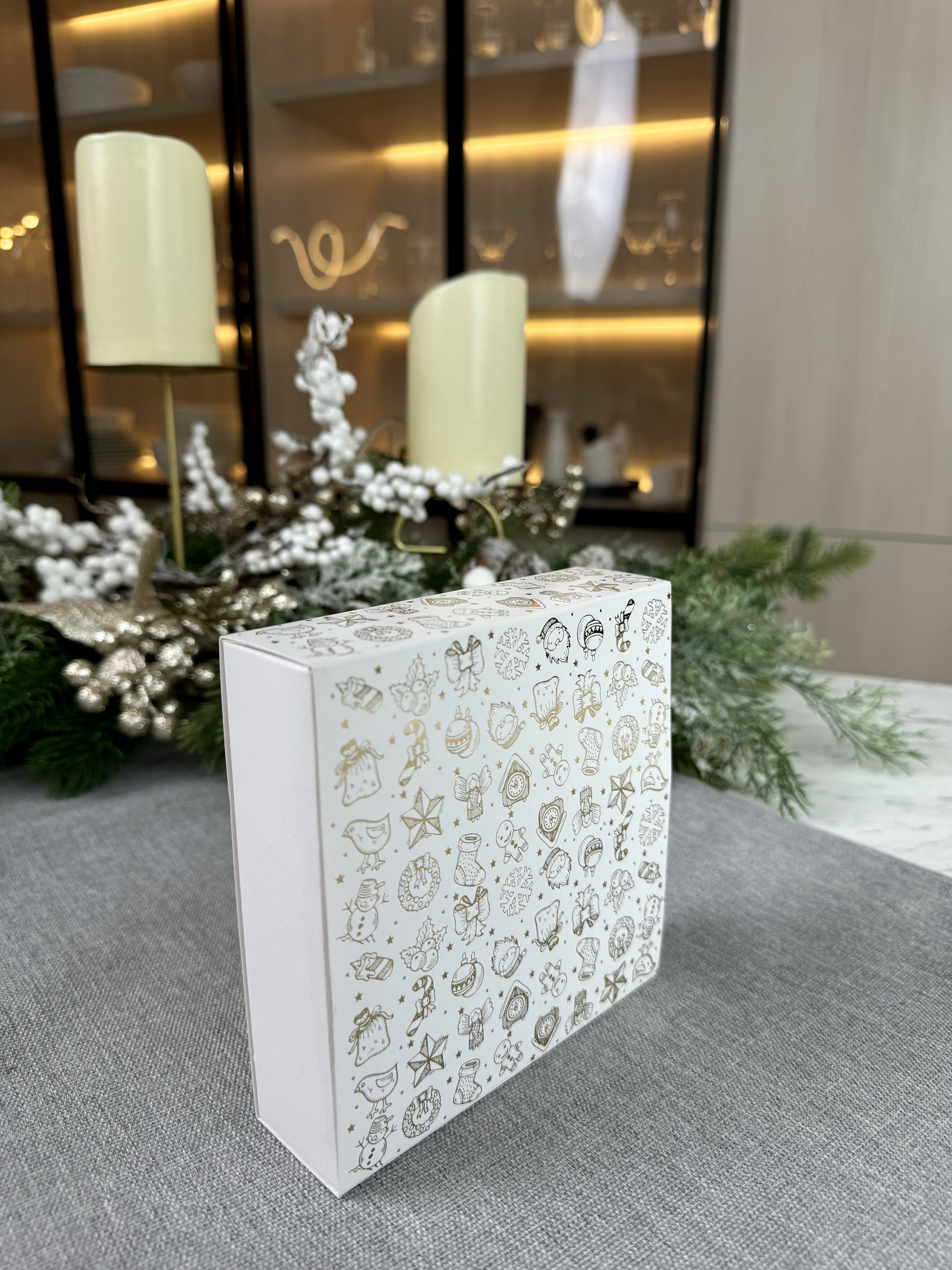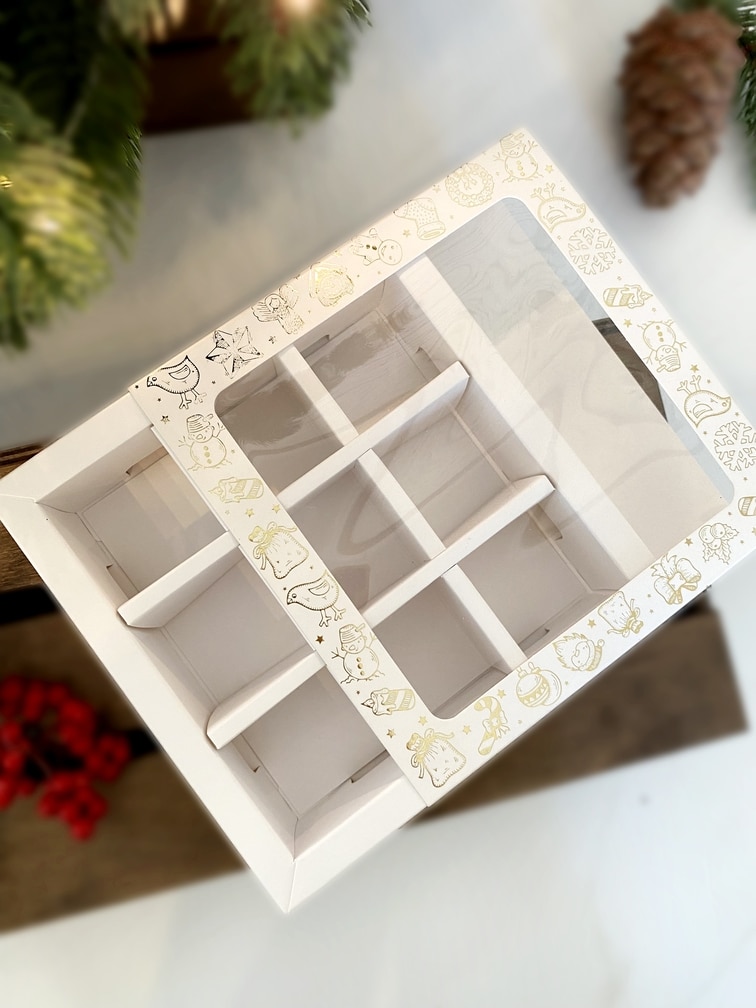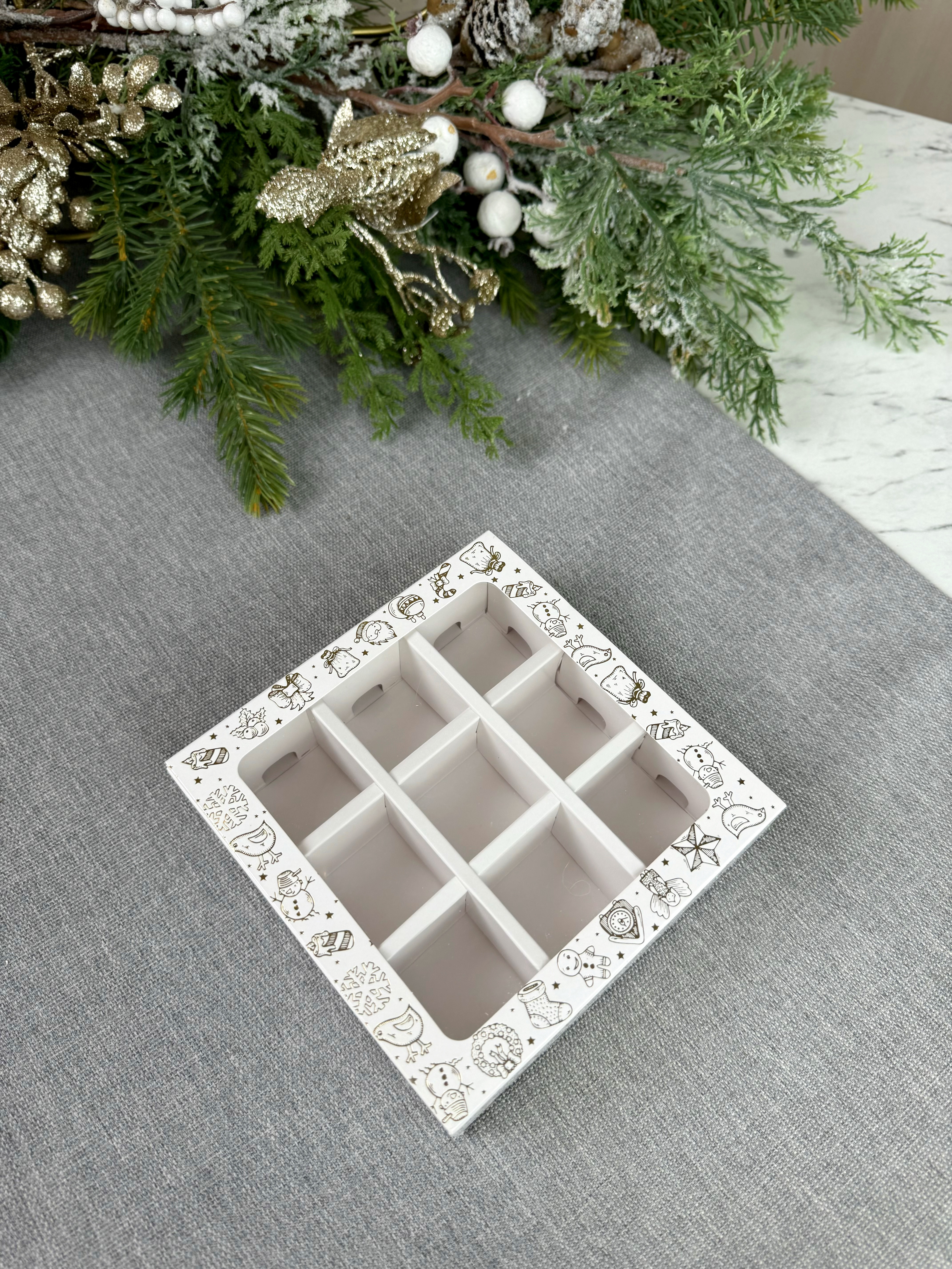 Коробка с обечайкой - коробка пенал на 9 конфет с внутренними разделителями для конфет с Новогодней тематикой, размер ячейки 35х35х35 мм. Без разделителей подходит для размещения пряников, печенья и иных сладких презентов. Может быть использована для размещения изделий ручной работы