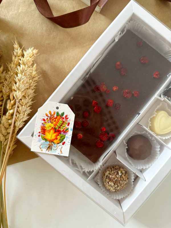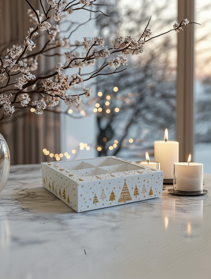 Новогодняя коробка с внутренними тонкими разделителями, подходит для размещения макарун, печенья, пряников, мармелада, пирожных моти и иных сладких презентов. Может быть использована для изделий ручной работы.