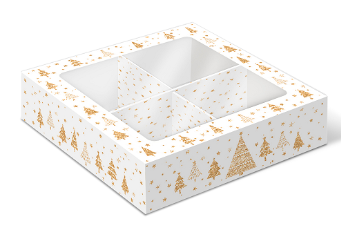 Коробка с окном 4 макаронс/моти/конфеты Золотые елочки, 126х126х35 мм (крышка-дно)