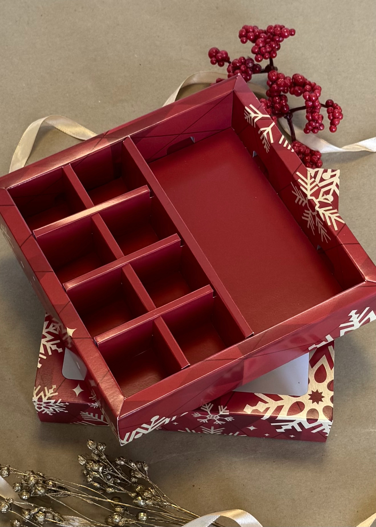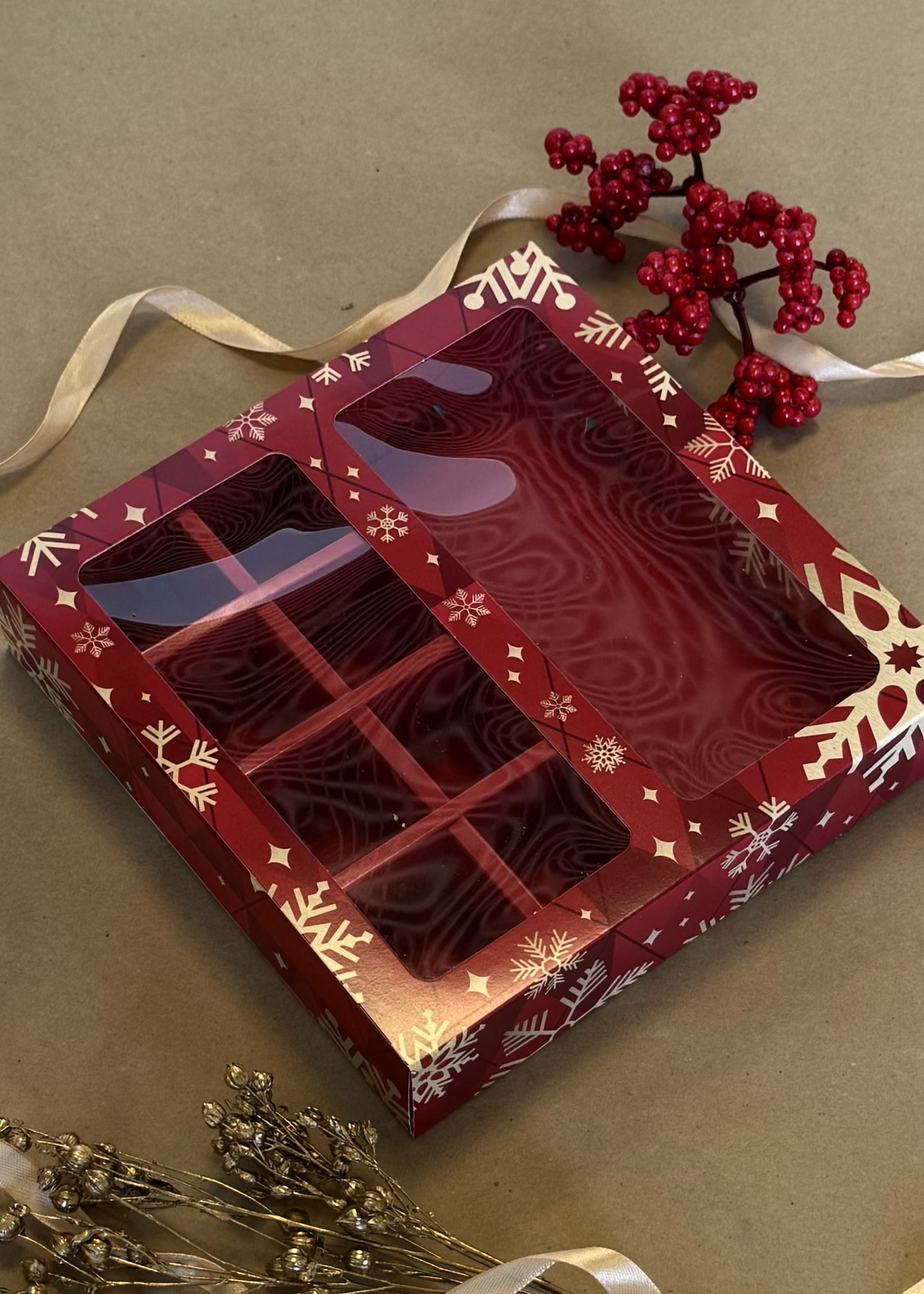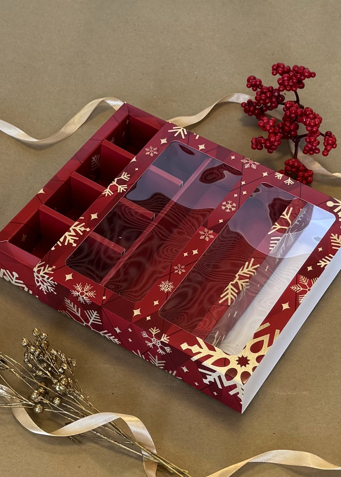 Коробка с окном 8 конфет плитка шоколада Золотые снежинки, 177х178,5х38,5 мм (дно и обечайка)