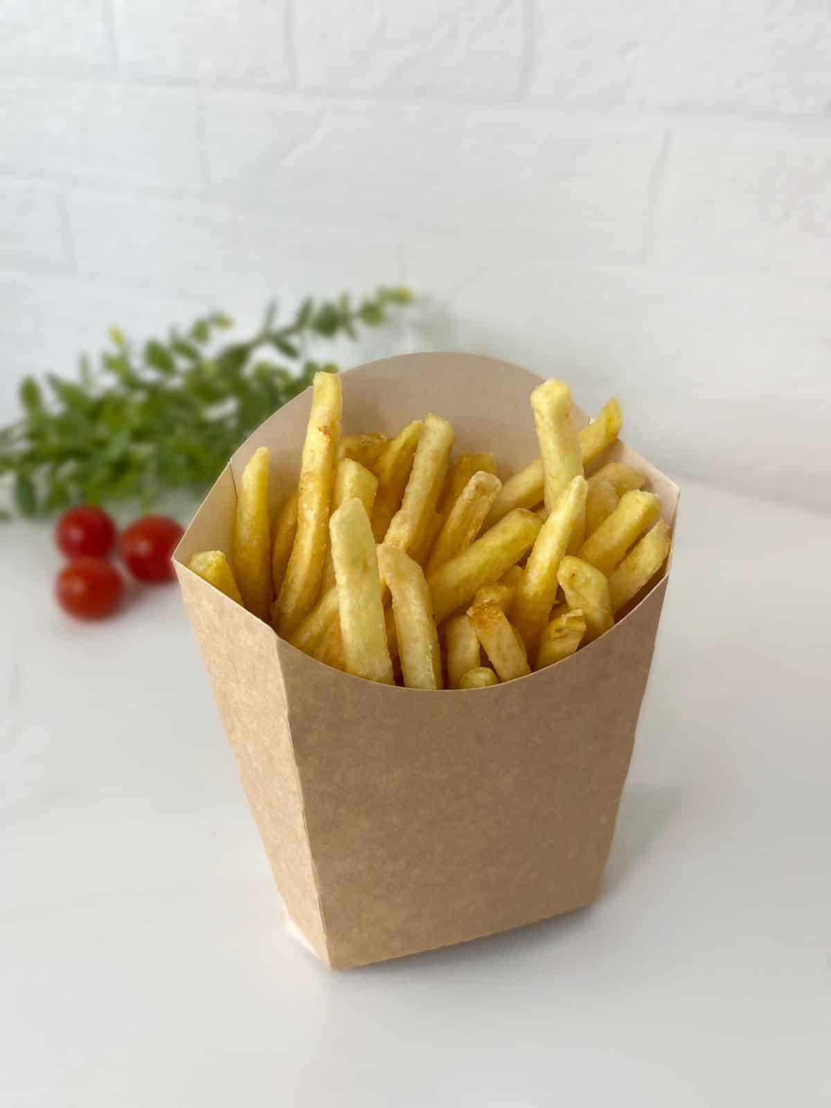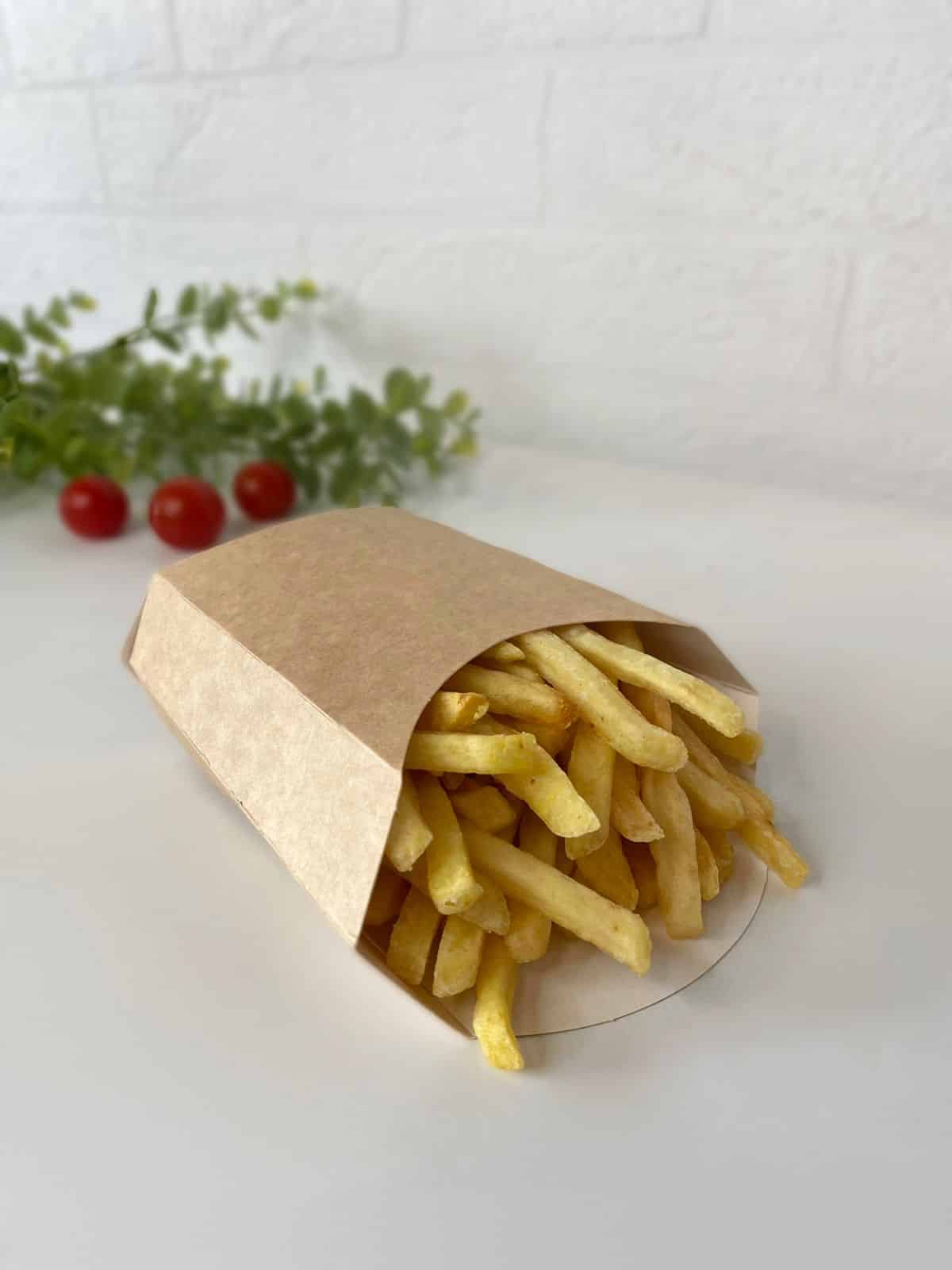 Новинка 2023 года. Бумажный одноразовый лоток для картофеля фри с внутренней ламинацией. Вмещает в себя 100 грамм продукта. Подходит для размещения наггетсов, чипсов, луковых колец и прочего фастфуда. Можно разместить даже пышку или пончик диаметром до 9 см. Удивите своих близких оригинальной подачей классической картошки фри, дети обязательно оценят;)