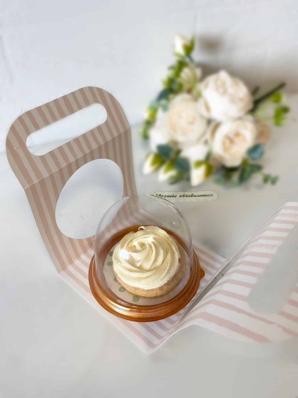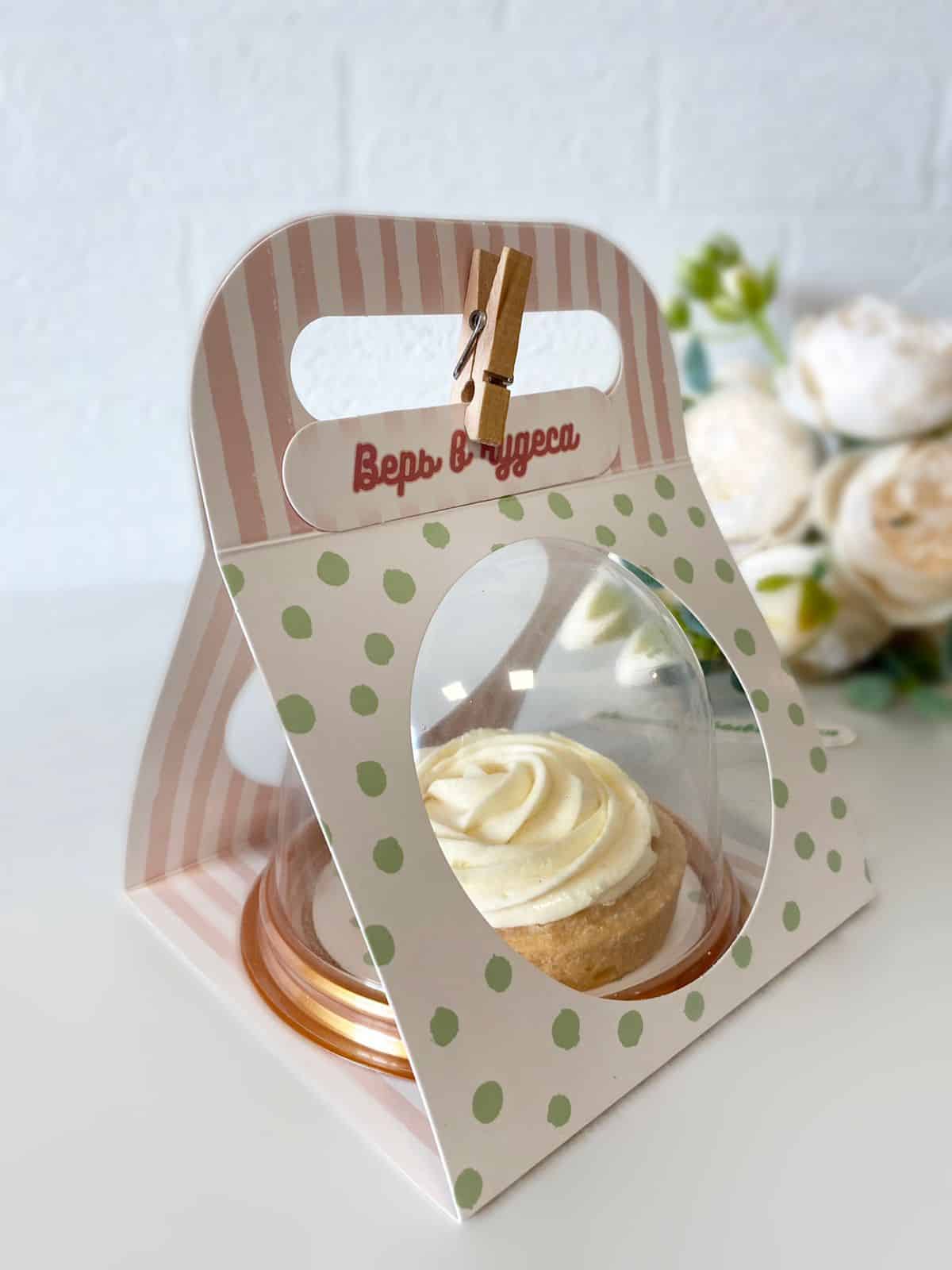 Упаковка в виде сумочки для удержания купольной упаковки для 1 капкейка/пирожного/шоколадной фигурки. Размер изделия в собранном виде: высота с ручкой 15 см, ширина 10,5 см, глубина 11,2 см. В комплекс выходит сумочка, 2 круглые подложки под пирожные диаметром 8,5 см и 2 бирочки с пожеланиями.