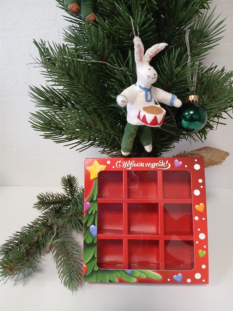 Коробка с окном под 9 конфет Веселая Елка, 138х138х38 мм (дно и обечайка)